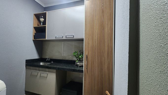 🔆Área Gourmet/Cozinha com cristaleira mega espaçosa equipada com coifa e churrasqueira e Grelha Parrilha, bem planejadinha para um lazer gostoso com toda a família, tudo no Mármore São Gabriel e fechamento em Blindex